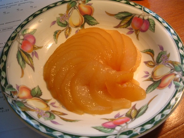 燉糖梨是去咳化痰的聖品,不過今天所要介紹的這道是純粹的甜點,不敢保證它會有任何療效。這道煨糖梨是用炆火(或烤箱)煮約一個半小時,使梨子充分吸收糖水、果香和茶香,吃入口中先是甜味,再來是淡淡似藍梅的果香,最後浮現的是茶香,是很多層次的一道中式甜點,熱食或冰食都很讚。