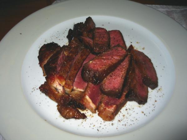 - 醃透後,在平底鍋放橄欖油,油稍熱之後放牛排下去煎,先小火來控制熟度(五分熟大蓋全部要煎七分鐘,不過要看牛排厚度),要起鍋前開中大火,把兩面煎的微焦。